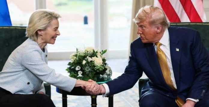 وأعلن الرئيس الأميركي دونالد ترمب ورئيسة المفوضية الأوروبية أورسولا فون دير لاين الاتفاق في 27 يوليو (تموز) في ملعب ترمب للغولف في تيرنبيري، اسكوتلندا، بعد اجتماع استمر ساعة واحدة أعقب شهوراً من المفاوضات.