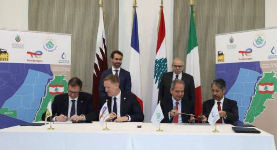 وقع عن الجانب اللبناني وزير الطاقة والمياه جو صدي، وعن شركة ” توتال انرجيز” مدير “توتال لبنان” رومان دولامارفينيار، وعن جانب شركة “قطر للطاقة” رئيس التنقيب في الشركة علي عبدالله المانع، وعن جانب شركة “ايني” مدير شركة “أيني لبنان” أندريا كوزي، في حضور رئيس هيئة إدارة قطاع البترول في لبنان غابي دعبول وعضوي مجلس الادارة وسام الذهبي ووسام شباط، رئيس قسم الشرق الأوسط وشمال افريقيا في شركة “توتال انرجيز” جوليان بوجيه، وسفير ايطاليا في لبنان فابريسيو مارتشللي، سفير قطر سعود بن عبد الرحمن آل ثاني، وممثل سفير فرنسا برونو بريييرا.