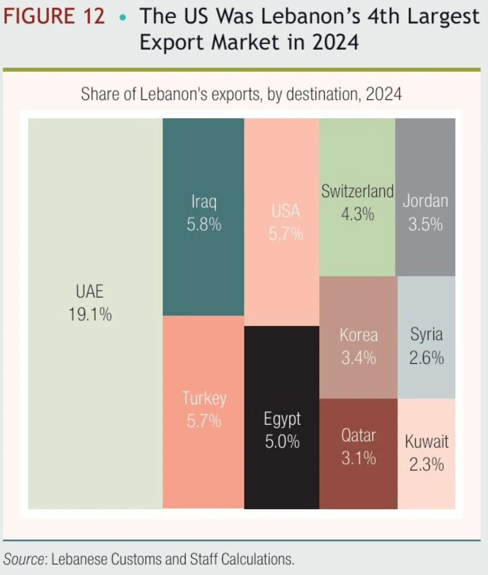 أما بالنسبة إلى الواردات إلى لبنان من الولايات المتحدة الأميركية والتي ليس لها علاقة بنسبة الـ 25 %، فبرزت الولايات المتحدة كتاسع أكبر مصدّر إلى لبنان بقيمة 570 مليون دولار استناداً إلى أرقام الجمارك، في حين أن الصين تحتل المرتبة الأولى في التصدير إلى لبنان بنسبة 11,6 % وتتبعها اليونان وسويسرا وتركيا.