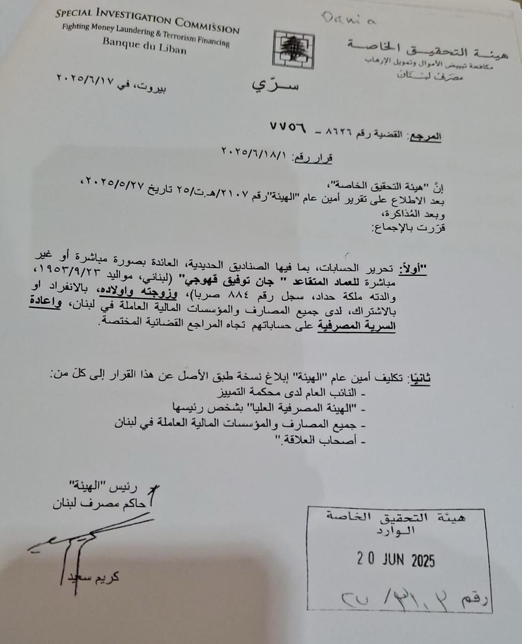 تفاعلت قضية رفع الحظر عن حسابات قائد الجيش السابق العماد جان قهوجي، بعد مسار قضائي طويل. وبعد اللغط الذي ساد لناحية الجهة التي قررت رفع الحجز عن حساباته المصرفية التي سبق وجُمدت بشبهة وجود فساد، أصدر مصرف لبنان بيانًا توضيحيًّا، خصوصًا بعد انتشار صورة عن قرار وقعه حاكم مصرف لبنان كريم سعيد في هذا الشأن. وجاء في البيان الصادر عن وحدة الإعلام والعلاقات العامة في مصرف لبنان ما يلي: