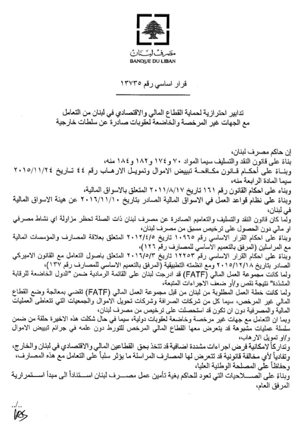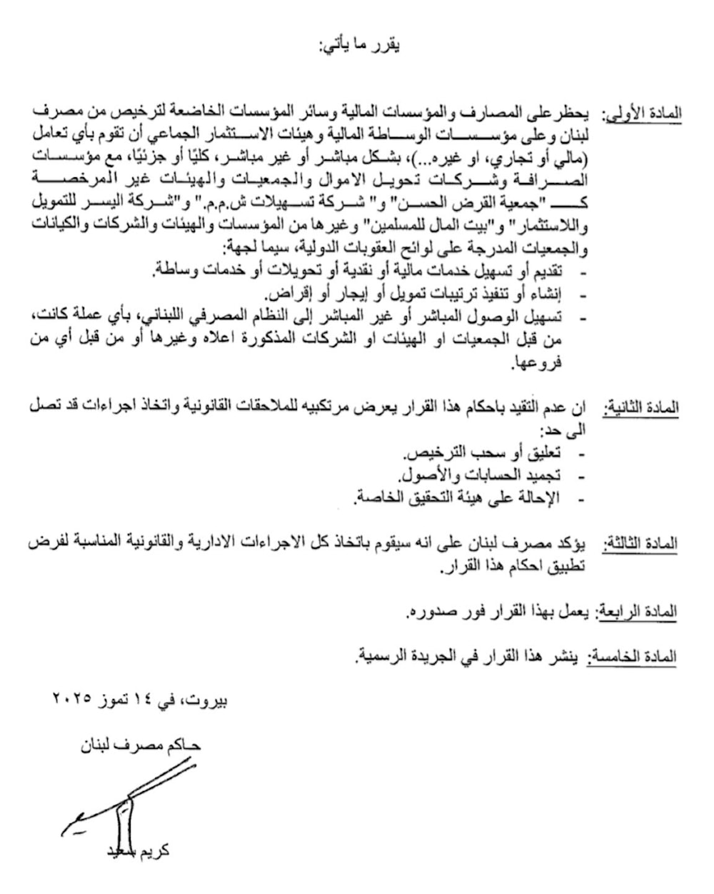 وجاء في تعميم نشره مصرف لبنان، أنه «لما كانت خطة العمل المطلوبة من لبنان من قبل مجموعة العمل المالي (FATF) تقضي بمعالجة وضع القطاع المالي غير المرخص… وتداركاً لإمكانية فرض إجراءات مشددة إضافية قد تتخذ بحق القطاعين المالي والاقتصادي في لبنان… يُحظر على المصارف والمؤسسات المالية وسائر المؤسسات الخاضعة لترخيص من مصرف لبنان وعلى مؤسسات الوساطة المالية وهيئات الاستثمار الجماعي، أن تقوم بأيّ تعامل بشكل مباشر أو غير مباشر، كلياً أو جزئياً، مع مؤسسات الصرافة وشركات تحويل الأموال والجمعيات والهيئات غير المرخصة كـ«القرض الحسن» و«شركة تسهيلات ش.م.م»، و«شركة اليسر للتمويل والاستثمار»، و«بيت المال للمسلمين» وغيرها من المؤسسات والهيئات والشركات والكيانات والجمعيات المدرجة على لوائح العقوبات الدولية».