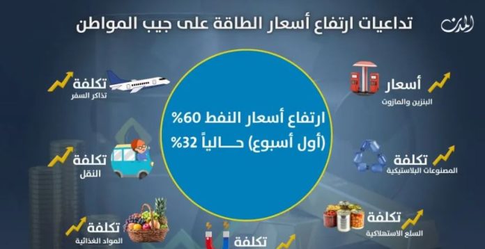 وقد انعكست الزيادة في أسعار النفط والغاز والبالغة أكثر من 60 في المئة خلال الأسابيع الأولى من الحرب، قبل أن تعود إلى نحو 30 في المئة، على جيوب المواطنين في غالبية الدول وامتد أثرها إلى صميم الحياة اليومية عبر موجة تضخم، وارتفاع في تكاليف الإنتاج والنقل وحتى أبسط السلع التي يتم استهلاكها يومياً.