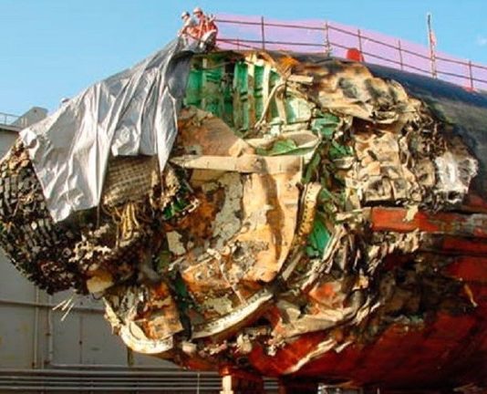 نشرت شبكات التواصل الاجتماعي صورا فوتوغرافية لغواصة "سان فرانسيسكو" الأمريكية بعد حادث اصطدامها بجبل تحت الماء في 8 يناير عام 2005.