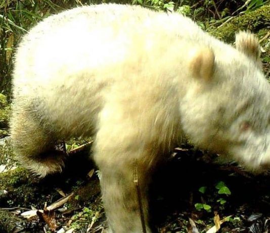 التقطت كاميرا لتصوير الحياة البرية في محمية طبيعية بمقاطعة سيشوان الصينية، صورة نادرة جدا لدب باندا أبيض بالكامل.