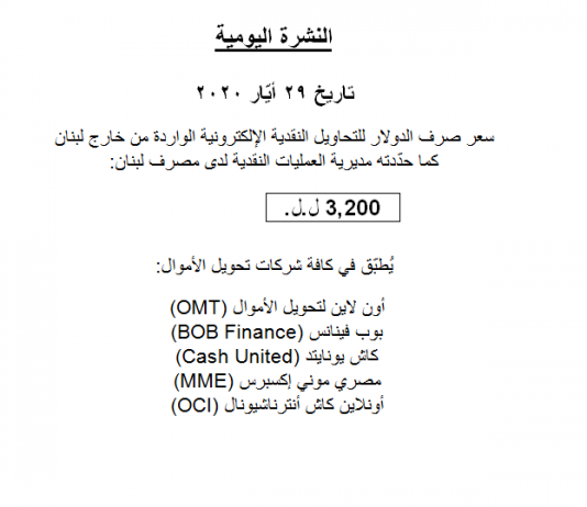 لا يزال سعر صرف الدولار للتحاويل النقدية الإلكترونية الواردة من خارج لبنان ثابتا كما حدّدته مديرية العمليات النقدية لدى مصرف لبنان اليوم، 3,200 ل.ل. ويطبق...