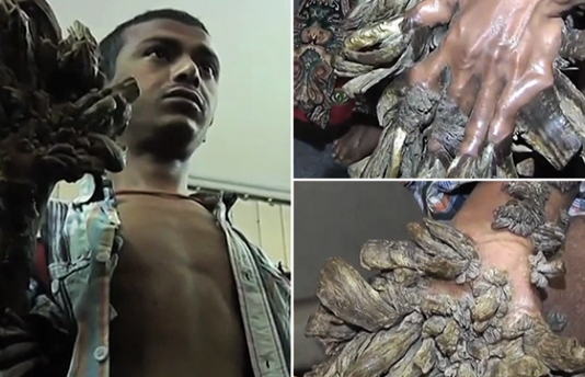 طالب رجل من بنغلاديش يعرف باسم "رجل الشجرة" عبر الإنترنت، ببتر يديه، جراء مرض جلدي نادر للغاية، في محاولة يائسة لتخفيف الألم.